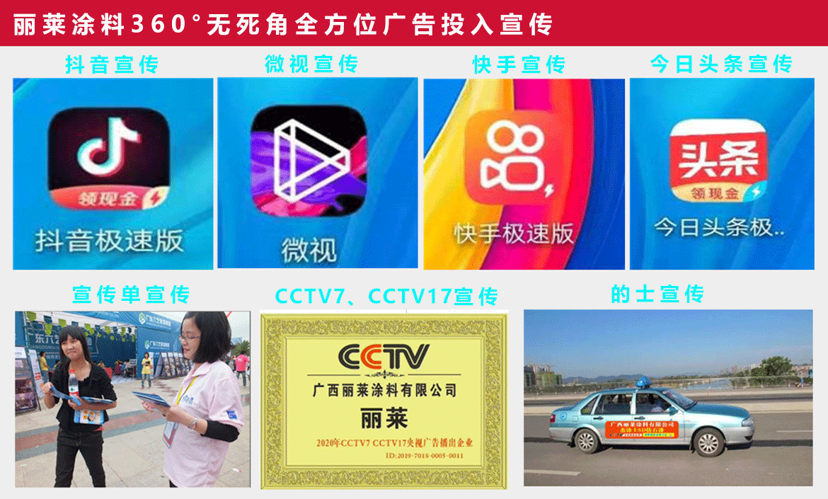 麗萊涂料持續投入數千萬元,在央視、地方衛視、報紙、雜志、戶外路牌等各大傳統媒體進行不間斷的形象廣告宣傳,在全球知名的阿里巴巴、新浪、網易、搜狐、慧聰、鳳凰網、中國建材網等新媒體進行全方位立體式傳播,關注健康生活,關注環保建設,迅速提升品牌知名度和美譽度。